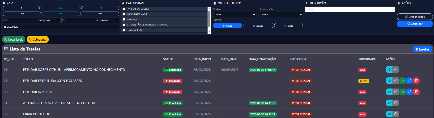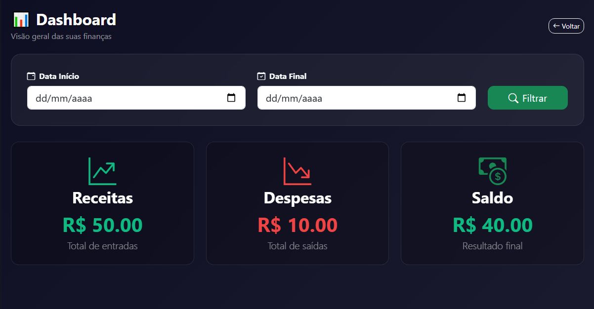 Dashboard, Finanças e Tarefas funcionando perfeitamente